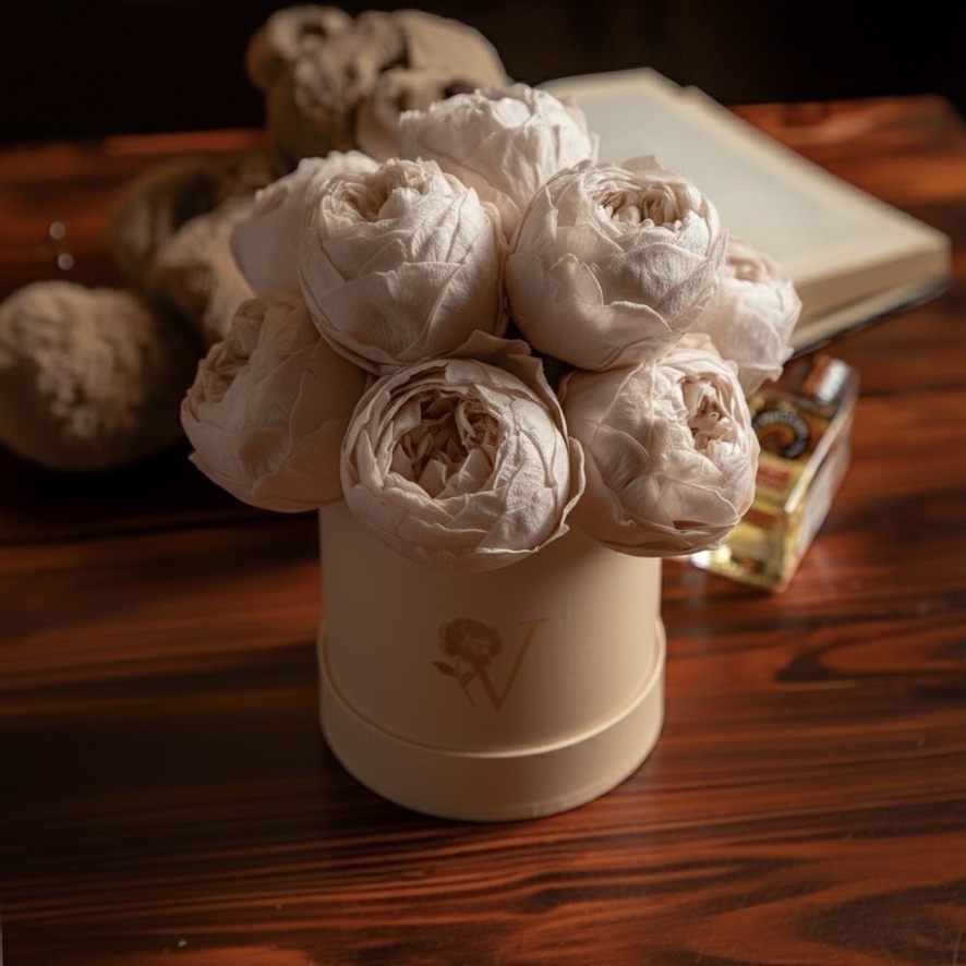 Éternelle Box | 12 Peonías es el máximo nivel de abundancia dentro de la colección. Doce peonías champagne preservadas se integran en una sola composición de lujo que roba miradas desde el primer segundo.
